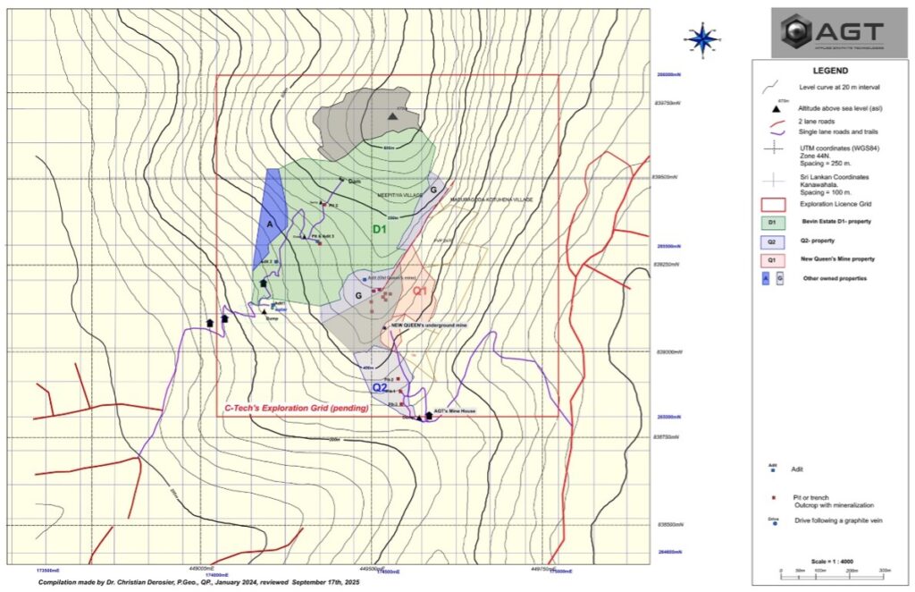 September 23, 2025 –Applied Graphite Technologies Corporation (“AGT”), (TSX-V: AGT) announces the acquisition of additional surface rights within the Queens Mines Complex (“QMC”). The QMC is located in the heart of the best graphite geology in Sri Lanka. Two of the three operating mines in Sri Lanka are located nearby and the QMC contains both historic and recent mine workings.